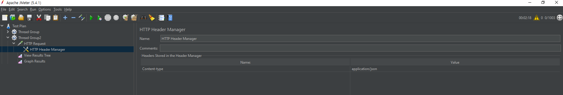 HTTP Request - Config Element - HTTP Header Manager 를 추가하고 Content-type application/json 을 추가해 줍니다.