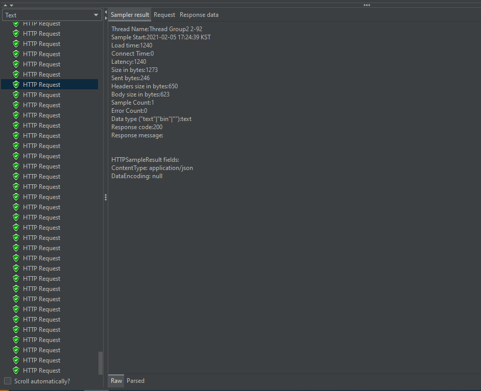 부하테스트 그래프와 요청Header/body 그리고 Response data까지 확인 할 수 있었습니다.